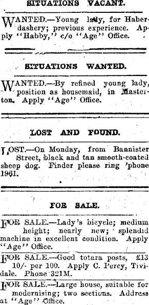 SITUATIONS VACANT. VtrANTED.—Young lady, for Haber- ’’ dashery; previous experience. Apply “Habby,” e/o “Age” Office. SITUATIONS WANTED. "WANTED.—By refined young lady, position as housemaid, in Jflastei:ton. Apply "Age” Office. LOST AND FOUND. iJ^OST.— -On Monday, from Bannister Street, black and tan smooth-eoated sheep dog. Finder please ring ’phone 1961. FOB SALE. JjKMi SALE.—Lady’s bicycle; medium height; nearly new; splendid machine in excellent condition. Apply “Age” Office. JpOlt SALE.—Good totara. posts, £l3 10/- per 100. Apply C. Percy, Tividale. Phone 321 M. JK>R SALE.—-Large house, suitable for modernising; two sections. Address at “Age” Office.