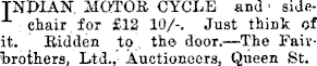 "INDIAN MOTOR CYCLE and sidechair for £l2 10/-. Just think of it. Ridden to the door.—The Fairbrothers, Ltd., Auctioneers, Queen St.