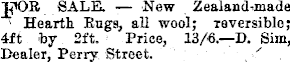 JpOR SALE. — New Zealand.made Hearth Rugs, all wool; reversible; 4ft -by 2ft. Price, 13/6. —D. Sim, Dealer, Perry Street.