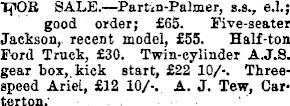 TpOR SALE.—Partin-Palmer, s.s., e.L; good order; £65. Five-seater Jackson, recent model, £55. Half-ton Ford Truck, £3O. Twin-cylinder A.J.S. gear box, kick start, £22 10/-. Threespeed Ariel, £l2 10/-. A. J. Tew, Carterton.