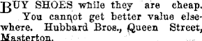 gUY SHOES while they are cheap. You canqot get better value elsewhere. Hubbard Bros., Queen Street, Masterton.