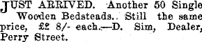 JUST ARRIVED; Another 50 Single Wooden Bedsteads. Still the same price, £2 8/- each.:—D. Sim, Dealer, Perry Street.