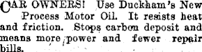 QAR OWNERS! Use Duckham’s New Process Motor Oil. It resista heat and friction. Stops carbon deposit and means more power and fewer repair bills.