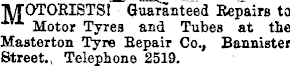 KTOTORISTS! Guaranteed Repairs to Motor Tyres and Tubes at the Masterton Tyre Repair Co., Bannister Street. Telephone 2519.