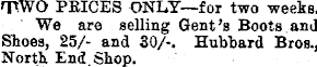 TWO PRICES ONLY—for two weeks. We are selling Gent’s Boots and Shoes, 25/- and 30/-. Hubbard Bros., North End Shop.