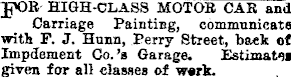 pOR HIGH-CLASS MOTOR CAR and Carriage Painting, communicate with F. J. Hunn, Perry Street, back of Impdement Co.’s Garage. Estimates given for all classes of work.