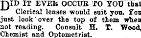 TYID IT EVER OCCUR TO YOU that Clerical lenses would suit you. You just look over the top of them when not reading. Consult H. T. Wood, Chemist and Optometrist.