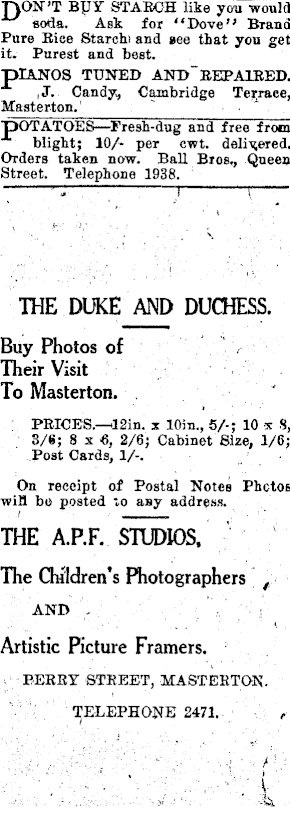 TYON’T BUY STARCH like you would soda. Ask for "Dove” Brand Pure Bice Starch: and see that you get it. Purest and best. pIANOS TUNED AND REPAIRED. J. Candy, Cambridge Terrace, Masterton. POTATOES —Fresh-dug and free from blight; 10/- per cwt. delivered. Orders taken now. Ball Bros., Queen Street. Telephone 1938. THE DUKE AND DUCHESS. Buy Photos of Their Visit To Masterton. PRICES.—I2in. x 10in., 5/-; 10 x 8, 3/6; Bx 6, 2/6; Cabinet Size, 1/6; Post Cards, 1/-. On receipt of Postal Notes Photos will be posted io any address. THE A.P.F. STUDIOS, The Children’s Photographers AND Artistic Picture Framers. PERRY STREET, MASTERTON. TELEPHONE 2471.