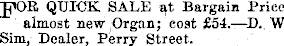 JpOR QUICK SALE at Bargain Price, almost new Organ; eost £54.—D. W. Sim, Dealer, Perry Street.