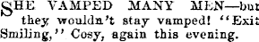 gHE VAMPED MANY MEN—but they wouldn’t stay vamped! “Exit Smiling,” Cosy, again this evening.