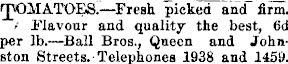 tpOMATOES. —Fresh picked and firm. Flavour and quality the best, 6d per lb.—Ball Bros., Queen and Johnston Streets. Telephones 1938 and 1459.