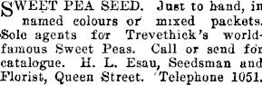 jg’WEET PEA SEED. Just to hand, in named colours or mixed packets. Sole agents for Trevethick’s worldfamous Sweet Peas. Call or send for catalogue. H. L. Esau, Seedsman and Florist, Queen Street. Telephone 1051.