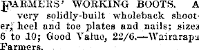 pARMERS’ WORKING BOOTS. A very solidly-built wholeback shooter, heel and toe plates and nails; sizes 6 to 10; Good Value, 22/0. —Wairarapa Farmers.