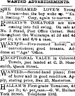 WANTED ADVERTISEMENTS. g!HE DREAMED LOVE’S Young Dream—but the boy woke up. “Exit Smiling. ” Cosy, again to-morrow. ROBERTS ’8 TOMATOES “are now coming into full awing. On sale at No. 2 Stand, Post Office Corner. Sold throughout the Wairarapa at 3d and 4d per lb; 4/6 and 6/6 a case. “W/ANTj?D.—Five-roomed house; all ' conveniences; good tenants. Address at “Age’ ’Office. EXCEPTIONAL VALUE in Coloured Towels, just landed at C. D. Shoosmith, Queen Street. VVANTED.—Secondhand piano; free of borer and in good condition. Apply, stating price, Bex 23, Masterton. LT ALLAM’S First-grade Tomatoes, 4d per lb; 6/- per.case.—G. W. Hallam York Street. Telephone 1102.