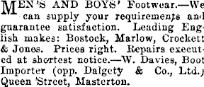 JJEN ’8 AND BOYS’ Footwear.—We can supply your requirements ami guarantee satisfaction. Leading English makes: Bostock, Marlow, Crockett & Jones. Prices right. Repairs executed at shortest notice.—W. Davies, Boot Importer (opp. Dalgety & Co., Ltd.) Queen 'Street, Mastertoil.