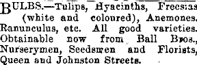 JJULBS. —Tulips, Hyacinths, Freesias (white and coloured), Anemones. Ranunculus, etc. All good varieties. Obtainable now from Ball Bros., Nurserymen, Seedsmen and Florists, Queen and Johnston Streets.