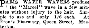 pARIS WATER WAVEBS produce the “Marcel” wave in a few minutes without injury to the hair. Simple to use and only 1/6 each. At Eton’s Pharmacy, Queen Street, Masterton.