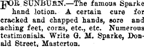 JpOR SUNBURN. —The famous Sparke hand lotion. A certain cure for cracked and chapped hands, sore and aching feet, corns, etc., ete. Numerous testimonials. Write G. M. Sparke, Donald Street, Masterton.
