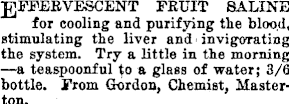 EFFERVESCENT FRUIT SALINE for cooling and purifying the blood, stimulating the liver and invigorating the system. Try a little in the morning —a teaspoonful to a glass of water; 3/6 bottle. From Gordon, Chemist, Masterton.
