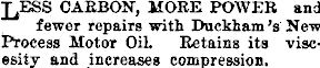 LESS CARBON, MORE POWER and fewer repairs with Duckham’s New Process Motor Oil. Retains its viseesity and increases compression.