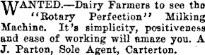 VWANTED.—Dairy Farmers to see tho "Rotary Perfection” Milking Machine. It’s simplicity, positiveness and ease of working will amaze you. A J. Parton, Sole Agent, Carterton.