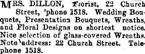 TVTRS. DILLON, Florist, 22 Church Street, ’phone 1518. Wedding Bouquets, Presentation Bouquets, Wreaths, and Floral Designs on shortest notice. Nice selection of glass-covered Wreaths. Note’’address: 22 Church Street. Telephone 1518.
