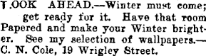 T.OOK AHEAD.—Winter must come; get ready for it. Have that room Papered and make your Winter brighter. See my selection of wallpapers.— C. N. Cole, 19 Wrigley Street.