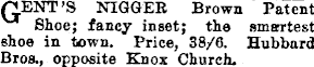 QENT’S NIGGER Brown Patent Shoe; fancy inset; the smartest shoe in town. Price, 38/6. Hubbard Bros., opposite Knox Church.