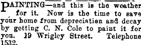 pAINTING —and this is the weather for it. Now is the time to save your home from depreciatien and decay by getting C. N. Cole to paint it for you. 19 Wrigley Street. Telephone 1532.