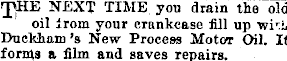 JHE NEXT TIME you drain the old oil from your crankcase fill up wi’i. Duckham’s New- Process Motor Oil. It forms a film and saves repairs.