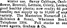 winter use. Savoy Cabbage, Cauliflower, Broccoli, Lettuce, Celery, Leeks; good healthy plants; now ready; 6d per bundle; can supply up to 10,000 of any variety. The Masterton Nurseriel (A Robinson & Sons), Whatman Road. Telephone 1304. Full stocks at our town agents. Graham & Co.
