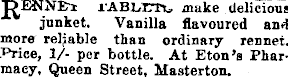 JDENNEa rABLTTTV, make delicious junket. Vanilla flavoured and more reliable than ordinary rennet. Price, 1/- per bottle. At Eton’s Pharmacy, Queen Street, Masterton.