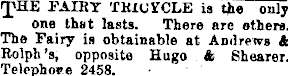rpHE FAIRY TRICYCLE is the’ only one that lasts. There are others. The Fairy is obtainable at Andrews & Rolph’s, opposite Hugo & Shearer. Telephone 2458.