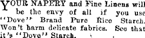 "yOUR NAPERY and Fine Linens will be the envy of all if you use "Dove” Brand Pure Rice Starch. Won’t harm delicate fabrics. See that it’s "Dove” Starch.