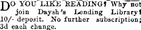 rjO YOU LIKE READING? WhyTEt join Daysh’s Lending Library? 10/- deposit. No further subscription; 3d each change.