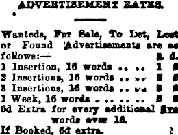 advertisement ratbr Wanteds, For Bale, To Det, Loit or Found Advertisements are aa follows:— ■. a. 1 Insertion, 16 words .... 1 0 2 Insertions, 16 words .. .. 1 6 3 Insertions, 16 words .. . . > 6 1 Week, 16 words 0 0 6d Extra for every additional fn worda over 16. If Booked, 6d extra.