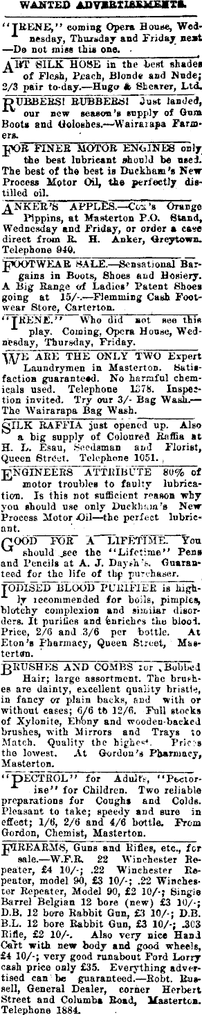 WANTED ADVBBTIBEMENTa. “TRENE, ” coming Opera Bou.bc, Wednesday, Thursday and Friday nest —Do not miss this one. iSILK HOSE in the best ahadea of Flesh, Peach, Blonde and Nude; 2/3 pair to-day.—Hugo & Shearer, Ltd. RUBBERS! RUBBEEB! Just landed, our new season’s supply of Gum Boots and Goloshes. —'Wairarapa Farmers. yOB FINER MOTOR ENGINES only the best lubricant should be used. The best of the best is Duckham’s New Process Motor Oil, the perfectly distilled oil. JUNKER ’S APPLES.—Cox’s Orange Pippins, at Masterton P.O. Stand, Wednesday and Friday, or order a case direct from R. H. Anker, Greytown. Telephone 940. yOOTWEAR SALE.— gains in Boots, Shoes and Hosiery. A Big Range of Ladies’ Patent Shoes going at 15/-. —Flemming Cash Footwear Store, Carterton. “TRENE.” Who~did not see this play. Coming, Opera House, Wednesday, Thursday, Friday. ARE THE ONLY TWO Expert Laundrymen in Masterton. Satisfaction guaranteed. No harmful chemicals used. Telephone 1378. Inspection invited. Try our 3/- Bag Wash.— The Wairarapa Bag Wash. gILK RAFFIA just opened up. Aho a big supply of Coloured Raffia at H. L. Esau, Seedsman and Florist, Queen Strdet. Telephone 1051. ENGINEERS ATTRIBUTE 80% of motor troubles to faulty lubrication. Is this not sufficient reason why you should use only Duckham’s New Process Motor -Oil—the perfect lubricant. r<OOD WIT A LIFETIME: You should see the “Lifetime” Pens and Pencils at A. J. Daysh’s. Guaranteed for the life of the purchaser. TODLSED~BLO<)D~PUEiFIER is highly i ecommended for boils, pimples, blotchy complexion and similar disorders. It purifies and fenriehes the blood. Price, 2/6 and 3/6 per bottle. At Eton’s Pharmacy, Queen Street, Masterttfn. gRUSHES AND COMBS xor .Bobbed Hair; large assortment. The brushes are dainty, excellent quality bristle, in fancy or plain backs, and with or without cases; 6/6 tb 12/6. Full stocks of Xylonite, Ebony and wooden-backed brushes, with Mirrors and Trays to Match. Quality the higher. Pric s the lowest. At Gordon’s Pharmacy, Masterton. “pECTROL” for Adult.-. “Ptctorine” for Children. Two reliable preparations for Coughs and Colds. Pleasant to take; speedy and sure in effect; 1/6, 2/6 and 4/6 bottle. From Gordon, Chemist, Masterton. pIREARMS, Guns and Rifles, etc., for sale.—W.F.R. 22 Winchester Repeater, £4 10/-; .22 Winchester Repeater, model 90, £3 10/-; .22 Winchester Repeater, Model 90, £2 10/-; Single Barrel Belgian 12 bore (new) £3 10/-; D.B. 12 bore Rabbit Gun, £3 10/-; D.B. B.L. 12 bore Rabbit Gun, £3 10/-; .303 Rifle, £2 10/-. Also very nice Hani Cert with new body and good wheels, £4 10/-; very good runabout Ford Lorry cash price only £35. Everything advertised can be guaranteed.—Robt. Bussell, General Dealer, corner Herbert Street and Columba Road, Mastertcn. Telephone 1884.