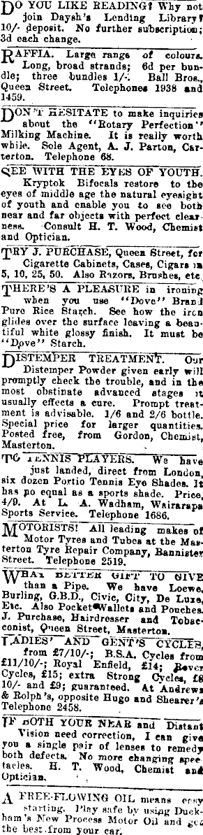 £)O YOU LIKE READING? Why not join Daysh’s Lending Library? 10/- deposit. No further subscription; 3d each change. JJAFFTA. Large range of colours. Long, broad strands; 6d per bundle; three bundles 1/-. Ball Bros., Queen Street. Telephones 1938 and 1459. 'T HESITATE to make inquiries about the “Rotary Perfection” Milking Machine. It is really worth while. Sole Agent, A. J. Parton, Carterton. Telephone 68. CJIEE WIfSTTHE EYES OF YOUTH. Kryptok Bifocals restore to the eyes of middle age the natural eyesight of youth and enable you to see both near and far objects with perfect clear ness. Consult H. T. Wood, Chemist and Optician. J. PURCHASE, Queen Street, for Cigarette Cabinets, Cases, Cigars m 5, 10, 25, 50. Also Razors, Brushes, ete rpHERE’S A PLEASURE in ironing when you use “Dove” Bran 1 Pure Rice Stanch. See how the iron glides over the surface leaving a beautiful white glossy finish. It must be Starch. JJISTEMtER TREATMENT CHr Distemper Powder given early w-11 promptly cheek the trouble, and in the most obstinate advanced stages it usually effects a cure. Prompt treatment is advisable. ]/6 and 2/6 bottle. Special price for larger quantities. Posted free, from Gordon, Chemist, Masterton. T& a ENNIS “PLAYERS? W'e have just landed, direct from London, six dozen Portio Tennis Eye Shades. It has no equal as a sports shade. Price, 4/9. At L. A. Wadham, Wairarapa Sports Service. Telephone 1686. All leading makes of Motor Tyres and Tubes at the Masterton Tyre Repair Company, BannisteStreet. Telephone 2519. WBax bEttElc ’tiirr’ro GIVE than a Pipe, We have Loewe. Burling, G.8.D., Civic, City, De Luxe, Etc. Also and Pouches. J. Purchase, Hairdresser and Tobacconist, Queen Street. Masterton. T .ADIES ’ AND GENT’S CYCLES from £7/10/-; B.S.A. Cycles from £ll/10/-; Royal Enfield, £l4; Rover Cycles, £l5; extra Strong Cycles, £8 10/- and £9; guaranteed. At Andrews & Rolph’s, opposite Hugo and Shearer’s Telephone 2458. TF bOTITyOUK NEAR aniT Distant Vision need correction, I ean give you a single pair of lenses to remedy both defects. No more ehanging spec taeles H. T. Wood. Chemist and Optician. 2V LL-FLOWING OIL means entiy starting. Play Ba f e by usi#ig Duckham ’s New Process Motor Oil and gt u the bear from your car.