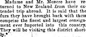 Madame and Mr. Menere have returned to New Zealand from their extended trip abroad. It is said that the furs they have brought back with them comprise the finest and largest consignment ever Imported into this country. They will be visiting this district shortly*