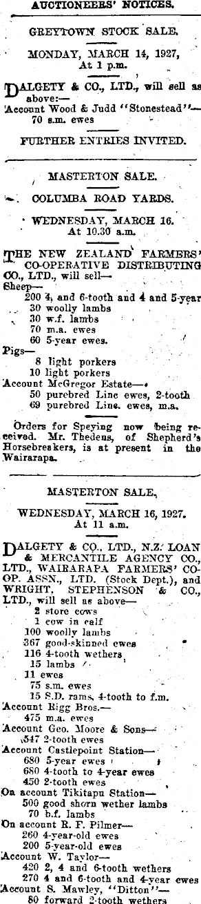 AUCTIONEERS’ NOTICES. GREYTOWN STOCK SALE. MONDAY, MARCH 14, 1927, At 1 p.m. TVALGETY & CO., LTD., will sell as above: — Account Wood & Judd “Stonestead”— 70 s.m. ewes FURTHER ENTRIES INVITED. MASTERTON SALE. COLUMBA ROAD YARDS. WEDNESDAY, MARCH 16. At 10.30 a.m. rpHE NEW ZEALAND' FARMERS’ CO-OPERATIVE DISTRIBUTING CO., LTD., will sell— Sheep—--200 4, and 6-tooth and 4 and 5 year 30 woolly lambs 30 w.f. lambs 70 m.a. ewes 60 5-year ewes. Pigs—--8 light porkers 10 light porkers Account McGregor Estate—• 50 purebred Line ewes, 2-tooth 69 purebred Line, ewes, m.a. Orders for Speying now being received. Mr. Thedens, of Shepherd’s Horsebreakers, is at present in the Wairarapa. MASTERTON SALE, WEDNESDAY, MARCH 16, 1927. At 11 a.m. TYALGETY & Cp.. LTD., N.Z. LOAN & MERCANTILE AGENCY CO., LTD., WAIRARAPA FARMERS’ COOP. ASSN., LTD. (Stock Dept.), and WRIGHT. ' STEPHENSON & CO., LTD., will sell as above—--2 store cows 1 cow in calf 100 woolly lambs 367 good-skinned ewes • 116 4-tooth wethers 15 lambs 11 ewes 75 s.m. ewes 15 S.D. rams. 4-tooth to f.m. Account Bigg Bros.— 475 m.a. ewes Account Geo. Moore & Sons — ,547 2-tooth ewes Account Castlepoint Station—--680 5-year ewes I 680 4-tooth to 4-year ewes 450 2-tooth ewes , On account Tikitapu Station—--500 good shorn wether lambs 70 b.f. lambs On account R. F. Pilmer—--260 4-year-old ewes 200 5-year-old ewes Account W. Taylor—--420 2, 4 and 6-tooth wethers 270 4 and 6-tooth and 4-year ewes Account S. Mawley, “Ditton”— | 80 forward 2-tooth wethers