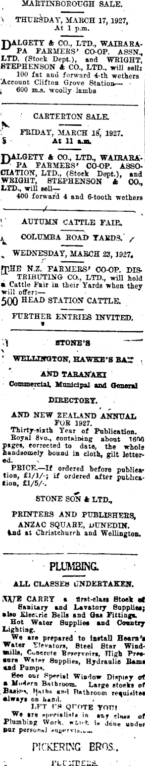 MARTINBOROUGH SALE. THURSDAY, MARCH 17, 1927, At 1 p.m. TYALGETY * CO., LTD., WAIRARAPA FARMERS’ CO-OP. ASSN., LTD. (Stock Dept.), and WRIGHT, STEPHENSON & CO., LTD., will sell: 100 fat and forward 4-th wethers Account Clifton G;ove Station—i 600 m.s. woolly lambs CARTERTON SALE. FRIDAY, MARCH 18, 1927. S At U a.m. TYALGETY & CO., LTD., WATRAWA. PA FARMERS’ CO-OP. ASSOCIATION, LTD., (Stock Dept.), and WBIQHT, STEPHENSON & CO., LTD., will sell—--400 forward 4 and 6-tooth wethers J- , AUTUMN CATTLE FAIE. COLUMBA ROAD YARDS. / . WEDNESDAY, MARCH 23, 1927, rpHE N.Z. FARMERS’ CO-OP. DISTRIBUTING CO., LTD., will hold a Cattle Fair in their Yards when they will offer:— 500 HEAD STATION CATTLE. FURTHER ENTRIES INVITED. I STONE’S WELLINGTON, HAWKE’S RAT AND TARANAKI Commercial, Municipal and General DIRECTORY. AND NEW ZEALAND ANNUAL FOR 1927. Thirty-sixth Year of Publication. Royal Bvo., containing about 1660 pages, corrected to date, the whole handsomely bound in cloth, gilt lettered. PRICE.—If ordered before publication, £l/1/-; if ordered after publication, £l/5/-. STONE SON k LTD., PRINTERS AND PUBLISHERS, ANZAC SQUARE, DUNEDIN. And at Christchurch and Wellington. PLUMBING. ALL CLASSES UNDERTAKEN. WE CARRY a flrst-class Stock at Sanitary and Lavatory Supplies; also Elee.ne Bells and Gas Fittings. Hot Water Supplies and Country Lighting. We are prepared to install Hearn’a Water Elevators, Steel Star Windmills, Concrete Reservoirs, High Pressure Water Supplies, Hydraulic Rama and Pumps. See our Special Window Display of a Modern Bathroom. Large stocks of Basil 1 *. Ijsilis and Bathroom requisites always on hand. , LFT US QUOTE YOU! We are specialists in elaas of Plumbing Work, wtriet. is done under Bur personal supervise.. PICKERING BROS.. PLUMBERS.