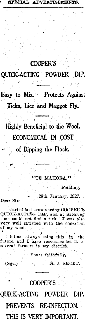 ( SPECIAL ADVERTISEMENTS. COOPER’S QUICK-ACTING POWDER DIP. Easy to Mix. Protects Against Ticks, Lice and Maggot Fly. Highly Beneficial to the Wool. ECONOMICAL IN COST of Dipping the Flock. “TE MAHORA,” Feilding. - 28th January, 1527. Dear Sirs — I started last season using COOPER’S QUICK-ACTING DIP, and at Shearing time could ndt find a tick. I was also very well satisfied with the condition of my wool. I intend always using this in the future, and I have recommended it to several farmers in my district. Yours faithfully, (Sgd.) N. J. SHORT. COOPER’S QUICK-ACTING POWDER DIP. PREVENTS RE-INFECTION. THIS IS VERY IMPORTANT.