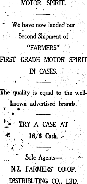 MOTOR SPIRIT. We have now landed our Second Shipment of “FARMERS” FIRST GRADE MOTOR SPIRIT IN CASES. The quality is equal to the wellknown advertised brands. i * to > TRY A CASE AT * . 16/6 Cash. — Sole Agents— N.Z. FARMERS’ CO-OP. DISTRIBUTING CO., LTD.