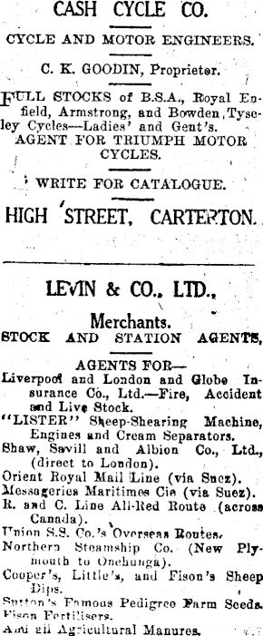 CASH CYCLE CO. CYCLE AND MOTOR ENGINEERS. C. K. GOODIN, Proprietor. FULL STOCKS of 8.5. A., Royal Enfield, Armstrong, and Bowden,Tyseley Cycles—Ladies’ and Gent’s. AGENT FOR TRIUMPH MOTOR CYCLES. WRITE FOR CATALOGUE. HIGH STREET, CARTERTON. LEVIN & CO.. LTD., Merchants. STOCK AND STATION AGENTS, AGENTS FOR— Liverpool and London and Globe Insurance Cd., Ltd.—Fire, Accident and Live Stock. “LISTER” Sheep-Shearing Machine, Engines and Cream Separators. Shaw, Savill and Albion Co., Ltd., (direct to London). Orient Royal Mail Line (via Suez). i Messageries Maritimes Cie (via Suez). R. and C. Line All-Red Route (across , Canada). % T T nion S.S. Co.’s Overseas Routes, Northern Steamship Co. (New Plymouth to Onehunga). Cooper’s, Little’s, and Fison’s Sheep Bips. 's Fnmoag Pedigree Farm Seeds. 1 Fertilisers. Ami ail Agricultural Manures.