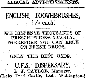 SPECIAL ADVERTISEMENTS. ENGLISH TOOTHBRUSHES, 1 /- each. WE DISPENSE THOUSANDS OF PRESCRIPTIONS YEARLY. THEREFORE YOU CAN RELY! ON FRESH DRUGS. ONLY THE BEST USED. U.F.S. DISPENSARY, L. J. TAYLOR, Manager. (Late Fred Castle, Ltd., Wellington.)