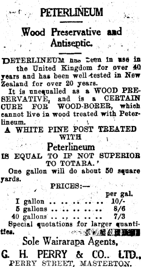 -> PETERLINEUM Wood Preservative a»d Antiseptic. DETERLINEUM nt>» teen in use in the United Kingdom for over 40 years and has been well -tested in New Zealand for over 20 years. It is unequalled as a WOOD PRESERVATIVE, and is a CERTAIN CURE FOR WOOD-BORER, whieh cannot live in wood treated with Peterlineum. A WHITE PINE POST TREATED WITH Peterlineum IB EQUAL TO IF NOT SUPERIOR TO TOTARA. One gallon will do about 50 square yards. PRICES:— per gal. I gallon 10/5 gallons 8/6 40 gallons .. 7/3 Special quotations for larger quanti- «»- Sole Wairarapa Agents, G. H. PERRY & CO.. LTD., PERRY STREET, MASTERTON.