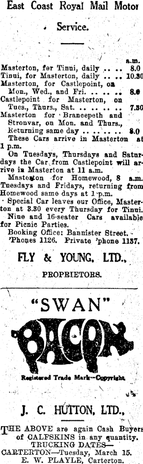 East Coast Royal Mail Motor Service. a.m. Masterton, fer Tinui, daily .... 8.0 Tinui, for Masterton, daily .. .. 10.30 Masterton, for Castlepoint, oa Mon., Wed., and Fri 8.6 Castlepoint for Masterton, on Tues., Thurs., Sat 7.30 Masterton for Branoepeth and Stronvar, on Mon. and Thurs., Returning same day ........ 8.0 These Cars arrive in Masterton at 1 p.m. On Tuesdays, Thursdays and Saturdays the Car from Castlepoint will arrive in Masterton at 11 a.m. Masteitfon for Homewood, 8 a.m. Tuesdays and Fridays, returning from Homewood same days at I -p.m. Special Car leaves our Office, Masterton at 3.30 every Thursday for Tinui. Nine and 16-seater Cars available for Picnic Parties. Booking Office: Bannister Street. ’Phones 1126. Private ’phone 1137. FLY & YOUNG, LTD., PROPRIETORS. “SWAN" w* Recistered Trade Marfc-CcpyrUH uV J. C. HUTTON, LTD., tpHE ABOVE are again Cash Buyers of CALFSKINS in any quantity. TRUCKING DATES—CARTERTON—Tuesday, March 15. E. W. PLAYLE, Carterton.