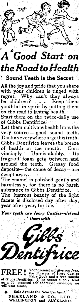 w A Good Start on the Road to Health Sound Teeth is the Secret AU the joy and pride that you share with your children is tinged with regret. Why can’t they always be children ? . . . Keep them youthful in spirit by putting them on the road to lasting health. Start them on the twice-daily use of Gibbs Dentifrice. Let them cultivate health from the very source — good sound teeth. Doctors everywhere urge this truth. Gibbs Dentifrice leaves the breeze of health in the mouth. Convincingly. Unmistakably. Its fragrant foam gets between and around the teeth. Greasy food deposits—the cause of decay—are swept away. The enamel is polished, gently and harmlessly, for there is no harsh substance in Gibbs Dentifrice. The lustrous beauty of the light facets is disclosed day after day, year after year, for life. Your teeth are Ivory Castlee—defend * them with U'rj'CE? ! Vour chemist will give you free, F Kl-qlx I Fortress of Ivory Castles . Fairy Book and a free sample of Gibbs Dentifrice. If he cannot supply, send uo a 2d. stamped self-addressed envelope, we will post direct. 19 Sole Agents for New Zealand: S H ARL AN D & CO.. LTD., WELLINGTON and AUCKLAND.
