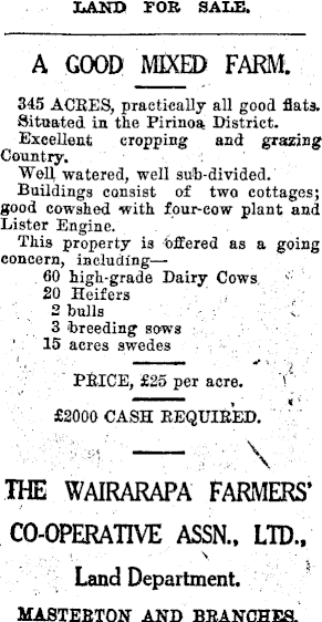 LAND FOR SALE. A GOOD MIXED FARM. 345 ACRES, practically all good flats. Situated in the Pirinoa District. Excellent cropping and grazing Country. Well watered, well sub-divided. Buildings consist of two cottages; good cowshed with four-cow plant and Lister Engine. This property is offered as a going concern, including—--60 high-grade Dairy Cows 20 Heifers 2 bulls 3 breeding sows 15 acres swedes PRICE, £25 per acre. £2OOO CASH REQUIRED. THE WAIRARAPA FARMERS’ CO-OPERATIVE ASSN., LTD., Land Department. MASTERTON AND BRANCHES.
