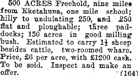 500 ACRES Freehold, nine miles from Eketahuna, one mile school; hilly to undulating 250, and 250 flat and ploughable; three paddocks; 150 acres in good milling bush. Estimated to carry 14 sheep besides cattle, two-roomed whare. Price, £6 per acre, with £l2OO cash. To be sold. Inspect and make an offer. (164)